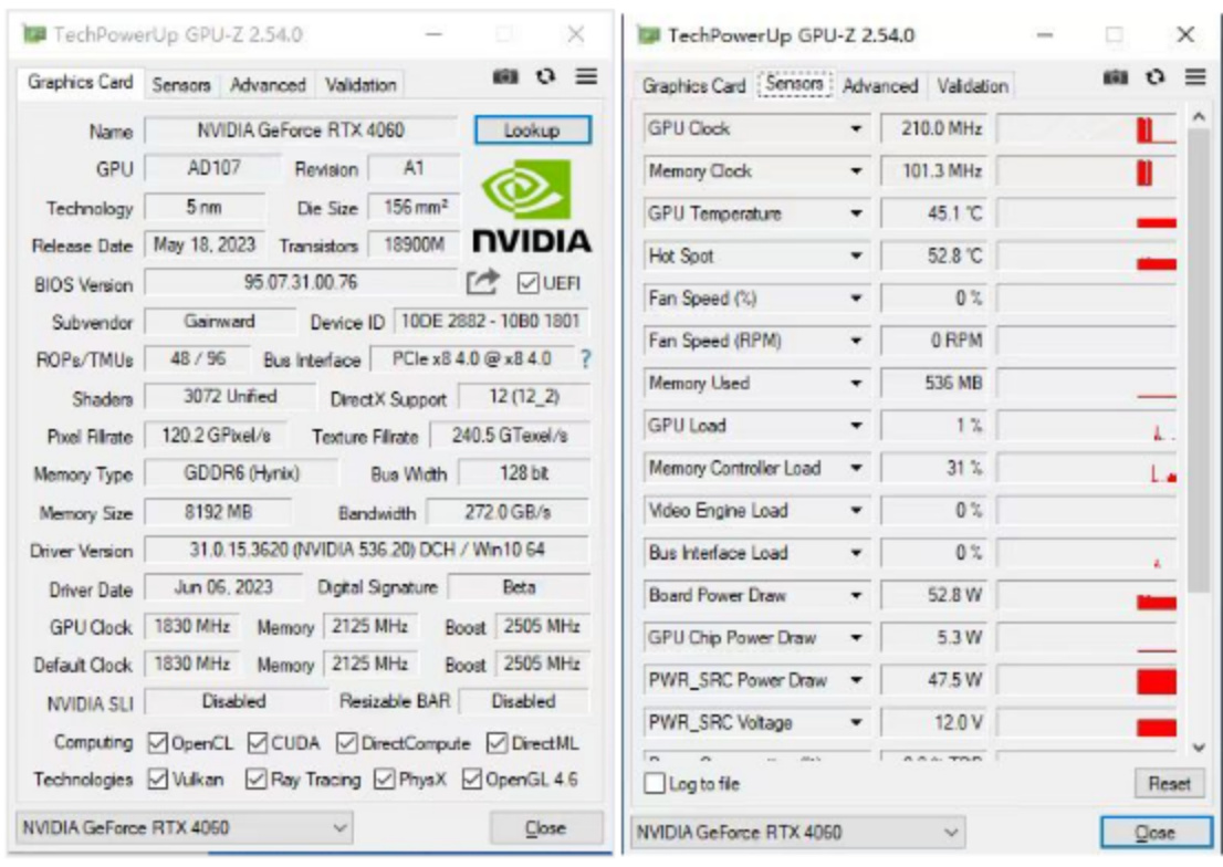 通过更新至最新的GPU Z 2.5.4版本,玩家们可以得到耕升 GeForce RTX 4060 追风中更为具体的参数表现和实际规格,通过数据我们可以看到耕升 GeForce RTX 4060 追风在待机温度下温度为45.1°C,功耗为7.68W。