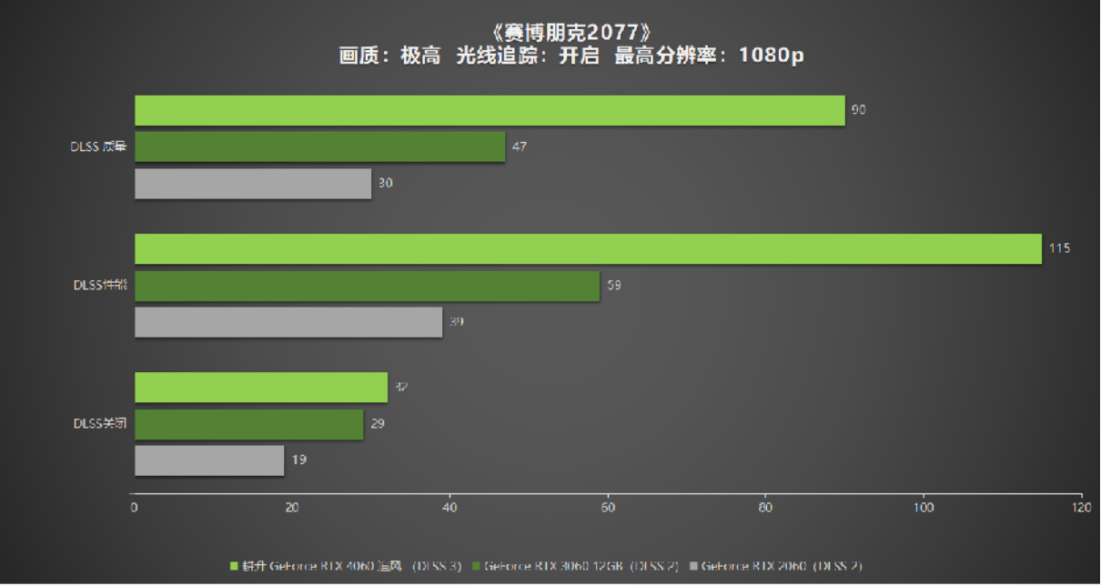 耕升 GeForce RTX 4060 追风 在1080P下即便是没有DLSS 3的加持也可以跑到45的帧数。而开启DLSS 3后则是分别可以达到85帧和104帧的高分。这款游戏GeForce RTX 3060 和GeForce RTX 2060 的则表现一般,即使开启DLSS 2的情况下,二者的帧数也仅仅是来到55帧和46帧。由见得对于如今最新的次世代游戏而言,搭载了DLSS 3的耕升 GeForce RTX 4060 追风 明显有着更大的优势。