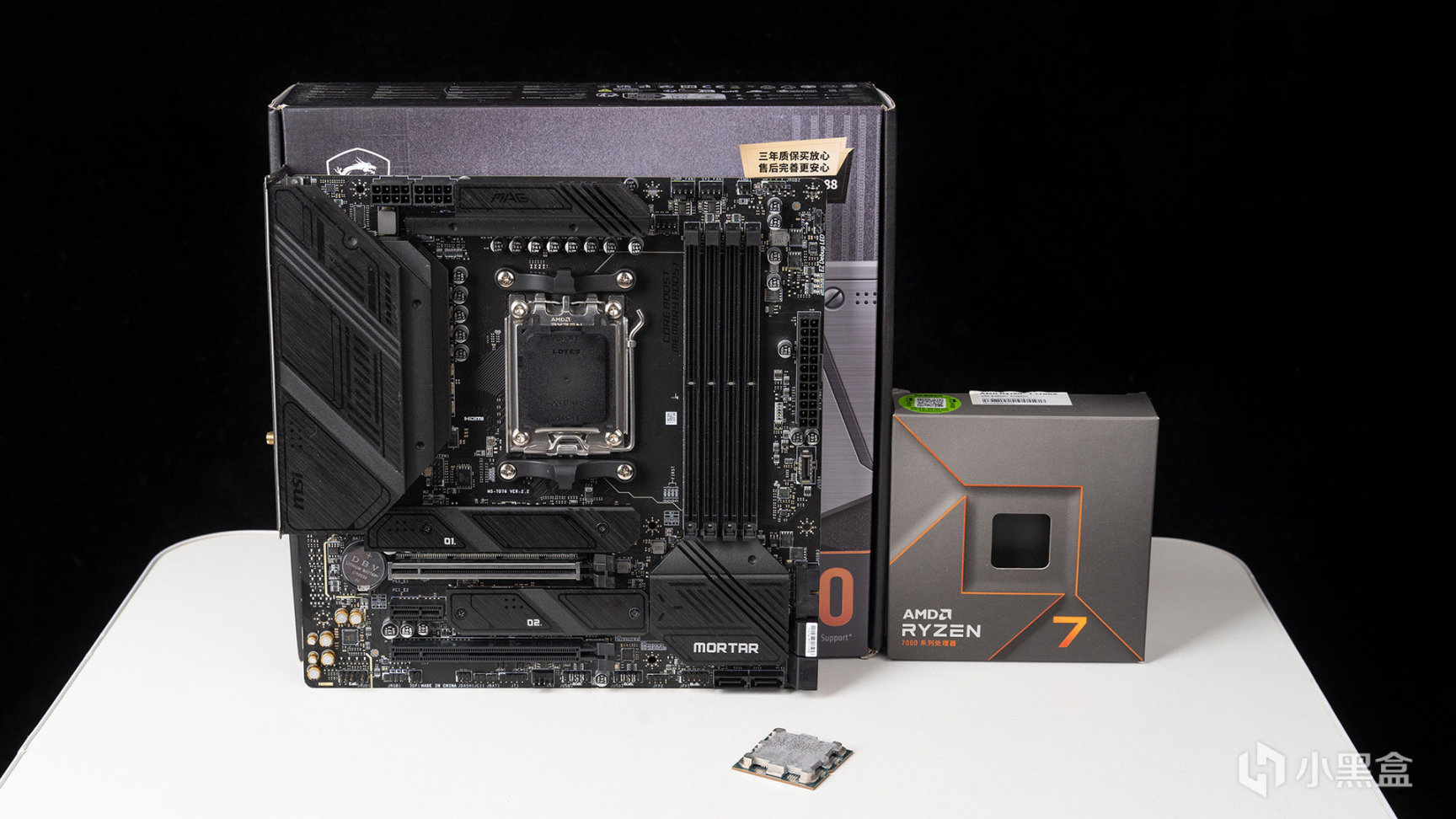 搭配测试的CPU是锐龙7 7700X,匹配这两款显卡正合适。主板座驾是微星MAG B650M MORTAR WIFI迫击炮,采用12+2相供电设计,负责CPU部分MOS最大电流可达到80A,在同价位M-MATX主板中规格很出众,外观采用全黑化造型,拥有两组带散热片、便捷卡扣设计的M.2插槽,配置丰富全锐龙7000产品都适用。