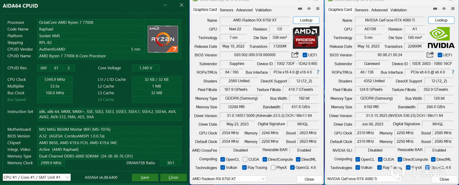 操作系统是Windows 11 22H2最新版本,锐龙7 7700X开启PBO技术符合大部分玩家使用习惯,搭配两根DDR5 6000C34 16GBX2组成双通道内存,并在BIOS中开启Resizable BAR技术提升一些显卡性能,AMD显卡安装的是Adrenalin 23.5.2 WHQL最新驱动,NVIDIA显卡也是最新的536.23 GameReady WHQL版本。