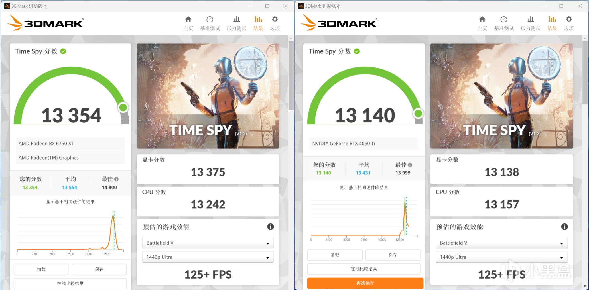 3DMark Time Spy项目,RX 6750 XT显卡分数为13375,RTX 4060 Ti显卡分数为13138