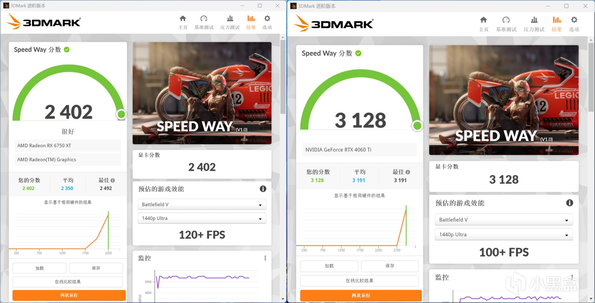 3DMark Speed Way项目,RX 6750 XT显卡分数为2402,RTX 4060 Ti显卡分数为3128