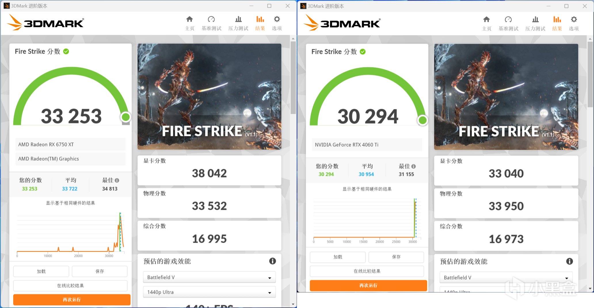 3DMark Fire Strike项目,RX 6750 XT显卡分数为38042,RTX 4060 Ti显卡分数为33040