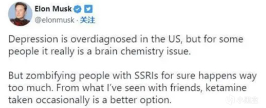 馬斯克推上回應說,抑鬱症有過度診斷的現象,但抗抑鬱類藥物把人變成殭屍,這種情況發生太多次了,偶爾服用氯胺酮是一個更好的選擇!