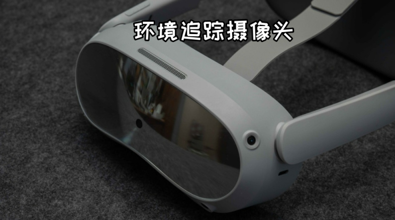凑近看一下摄像头的分布,头盔正面比较亮眼的就是头盔正面的一颗彩色透视摄像头,是一颗16mp透视摄像头。机身正面的四角是PICO团队自研的高精度四目环境追踪摄像头,5颗摄像头采集的数据通过 AI 空间深度计算和多视角融合算法,透视效果色彩真实细节丰富,无需摘下头显也可看清现实周围的环境。在设置实物围栏、还有运动采集、空间定位的过程中画质很清晰,空间感也很精准。