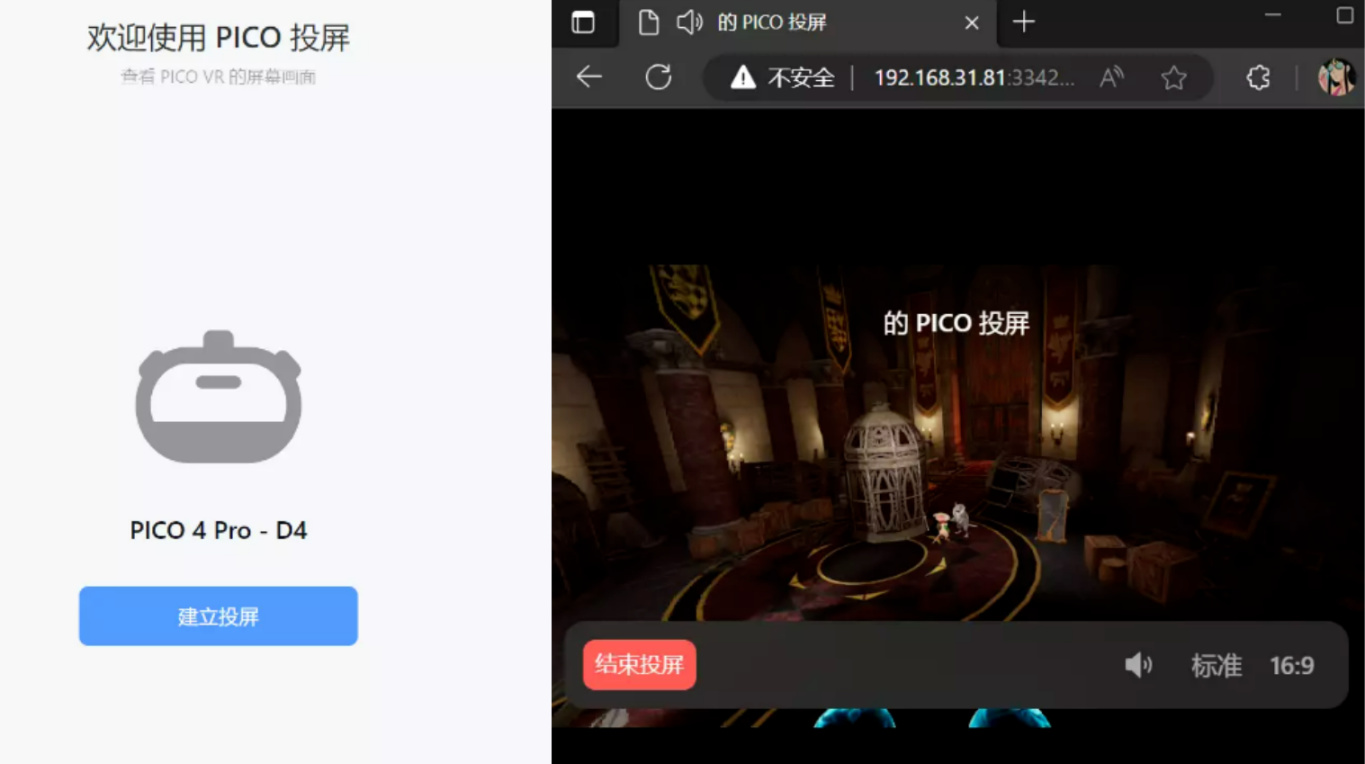 VR设备主打沉浸式体验,好处是你自己通过头盔就可以深度体验,可其他人就无法看到你在干什么,投屏播放这个功能正好可以把你看到的实时画面给共享出去跟大家分享。PICO 4 Pro支持手机、平板、电脑、浏览器等设备投屏。