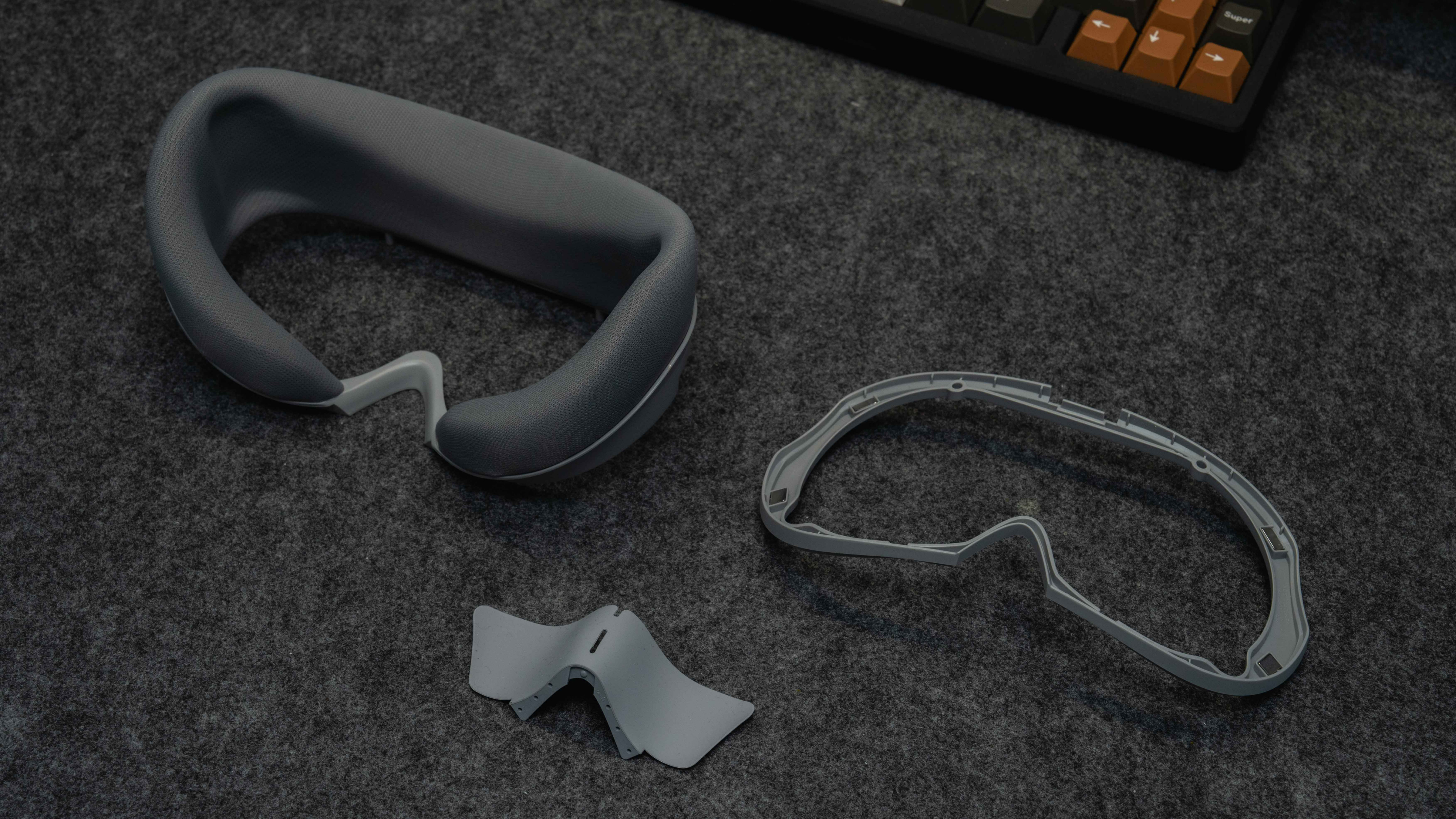 眼镜支架是自吸式结构,靠近眼镜部分就自动吸紧。玩的时候能够把眼镜架起来,缓解压力。遮光鼻托也是亲肤材质的,覆盖住眼镜与鼻子接触的地方,有这个组件几乎就感觉不到眼镜儿的存在了,可以和普通玩家一样享受不压眼的舒适体验。我家属表示这个配件是戴眼镜的人群的福音。