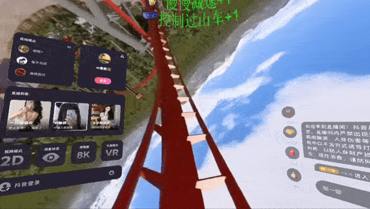 直播这几年火到不行,这种人与人可以交互的娱乐方式很符合人的需要,尝试了下PICO的直播功能,内容比较丰富,比如下面的过山车,因为视觉上带来的冲击,感觉整个人也跟着倾倒了,可想而知沉浸感是有多强。