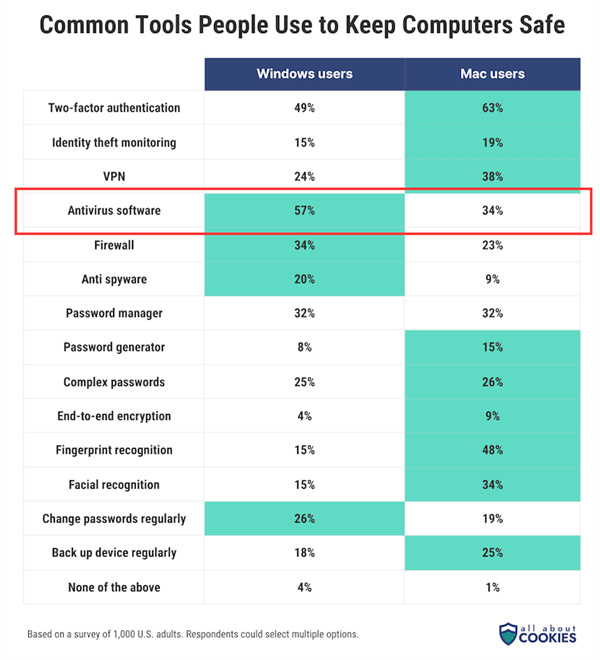 具體來說,在受訪的Windows用戶中,約有57%的用戶選擇使用防病毒安全軟件,而在macOS用戶中,僅有34%的用戶會選擇使用此類軟件。