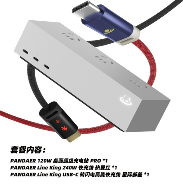 魅族还为 PANDAER 120W 桌面超级充电站 PRO 提供了套餐版,众筹价 499 元,套餐内包含 PANDAER120W 桌面超级充电站 Pro*1;PANDAER Line King 240W 快充线 热爱红 * 1;PANDAER Line King USB-C 转闪电高能快充线星际邮差 * 1。
