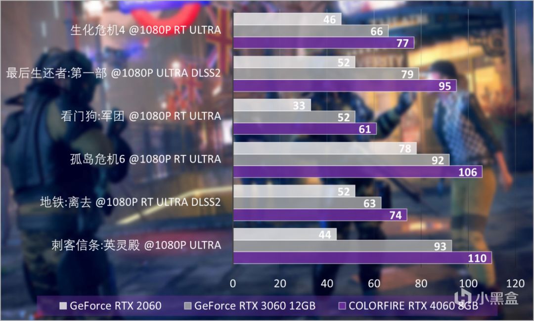 在《消逝的光芒2:人与仁之战》中,COLORFIRE GeForce RTX 4060暗影紫8GB带来的提升则更为明显,相对GeForce RTX 3060 12GB提升了67%,相对GeForce RTX 2060则提升了135%。