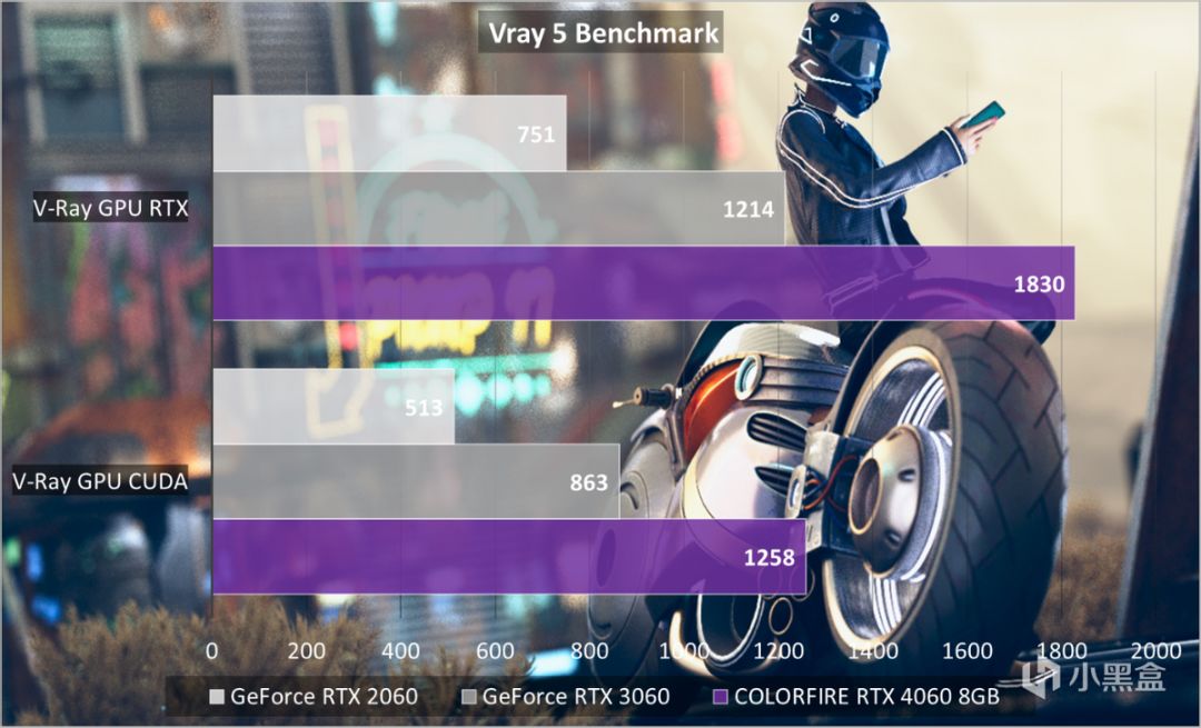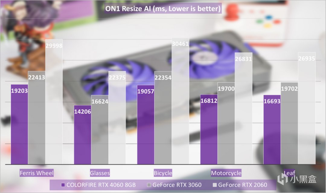 可以看到COLORFIRE GeForce RTX 4060暗影紫8GB相对GeForce RTX 3060 12GB节省14%的时间,相对GeForce RTX 2060节省37%的时间。