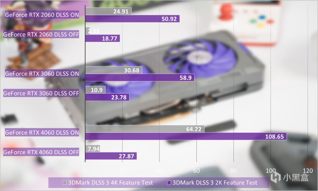 COLORFIRE GeForce RTX 4060暗影紫8GB无疑将DLSS 3的使用门槛向下降低了一大截。例如在3DMark DLSS功能测试中,可以看到COLORFIRE GeForce RTX 4060分别在2K分辨率和4K分辨率下,相对GeForce RTX 3060 12GB提升了80%和100%,同时相对GeForce RTX 2060提升了113%和150%以上。