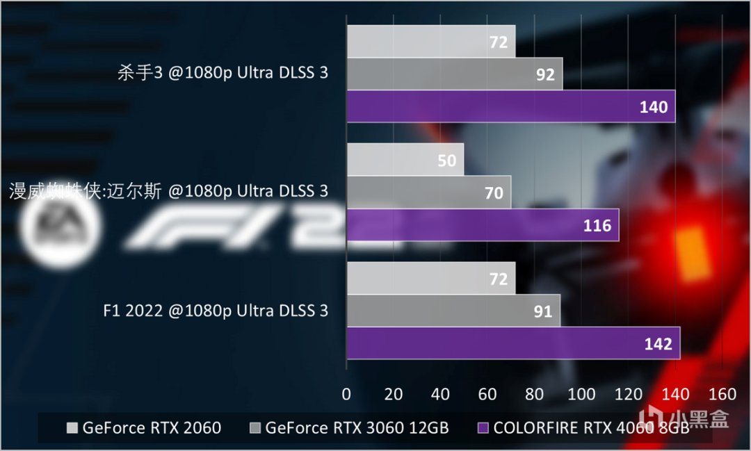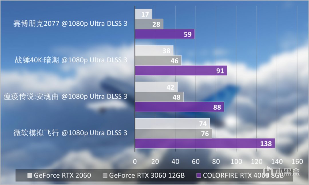 《赛博朋克2077》中则更为夸张,COLORFIRE GeForce RTX 4060相对GeForce RTX 3060 12GB提升了110%,相对GeForce RTX 2060则提升了247%。