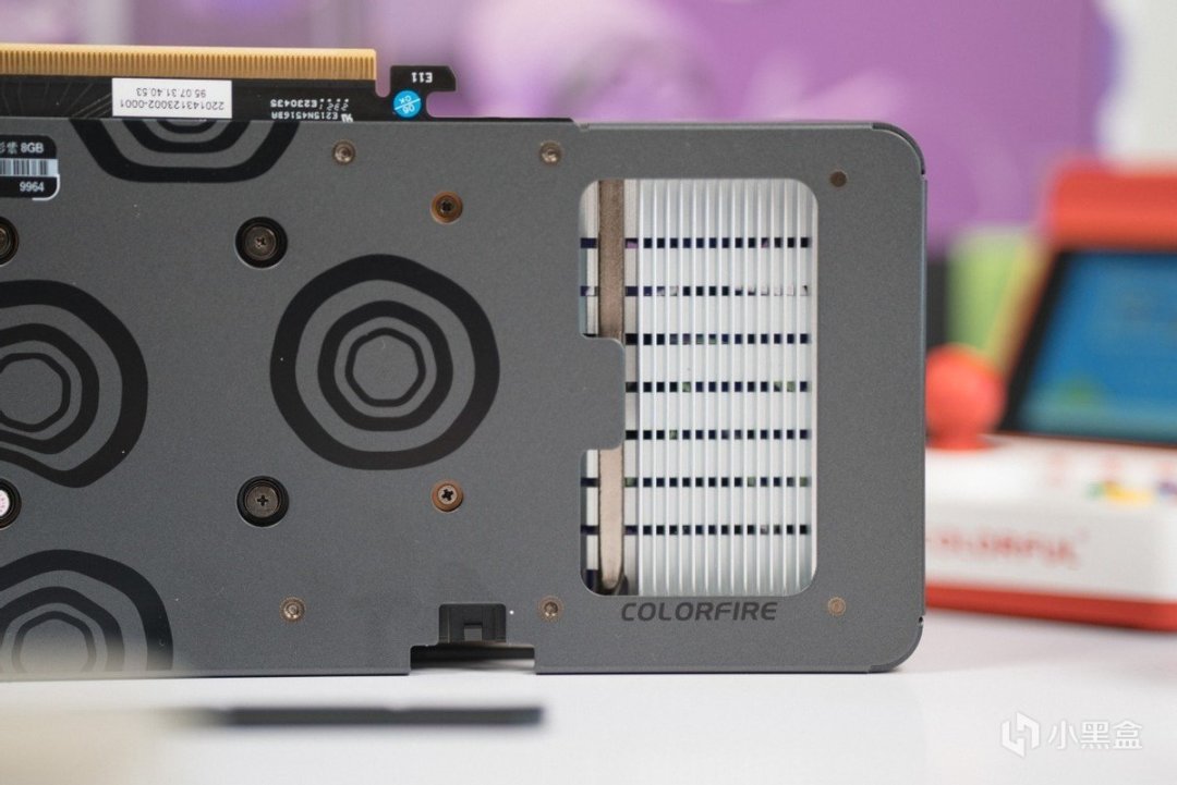 在接口设计上,COLORFIRE GeForce RTX 4060暗影紫8GB的电源部分使用了传统的8pin电源口,方便与老款电源兼容。显示输出接口则使用了3个DisplayPort 1.4a和1个HDMI 2.1接口设计。