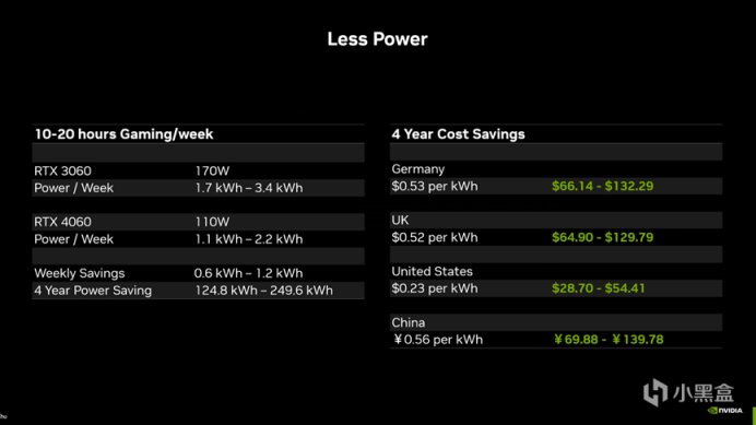 在宣传中,NVIDIA对GeForce RTX 3060和GeForce RTX 4060每周所产生功耗与电费做了统计,110W功耗的GeForce RTX 4060相对RTX 3060可以节省将近35%的费用。对于家用玩家而言,4年节省上百元似乎意义不大,但对于动辄上百台60系列GPU的电竞酒店和网吧业主,35%电费的节省可是一个不小的数额。由此看到COLORFIRE GeForce RTX 4060暗影紫8GB确实可以给PC节能提供不少贡献。