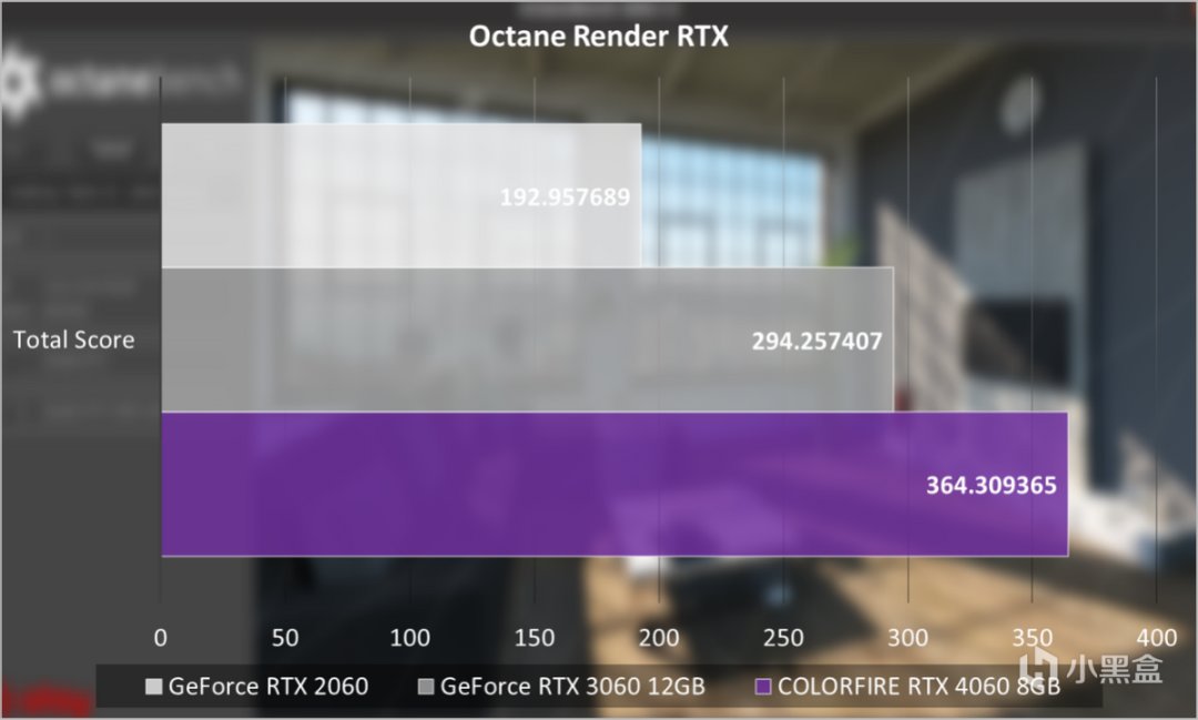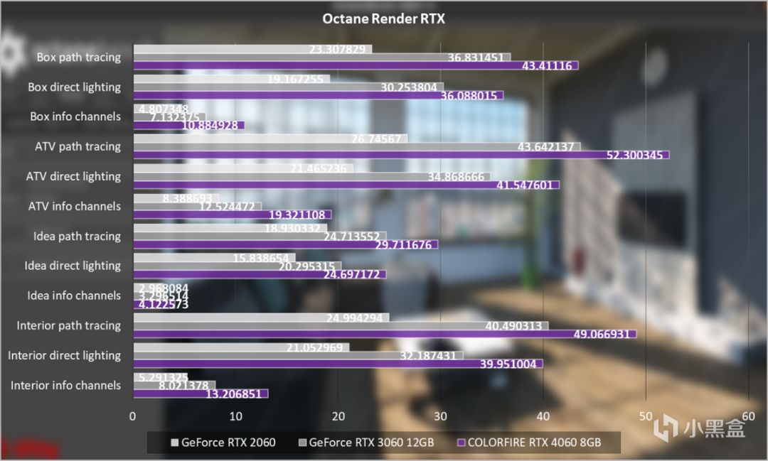 Octane Render RTX benchmark中,主要检测GPU的光追渲染性能,COLORFIRE GeForce RTX 4060暗影紫8GB相对GeForce RTX 3060 12GB提升23%,相对GeForce RTX 2060提升88%。