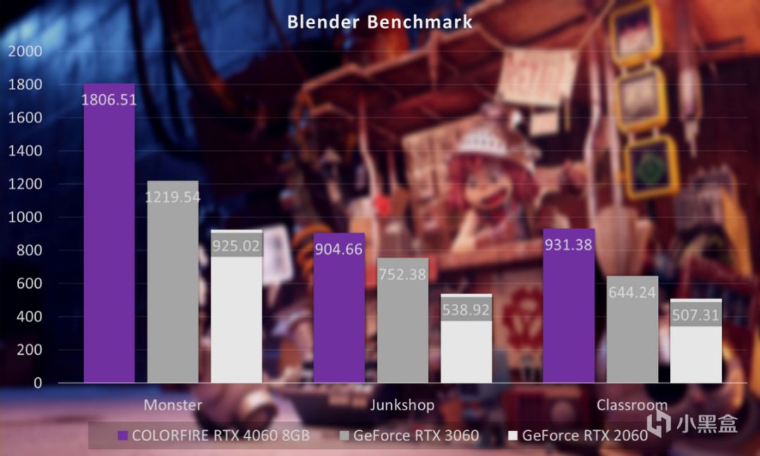 然后是Blender Benchmark,在Moster、Junkshop、Classroom三个输出场景中,COLORFIRE GeForce RTX 4060暗影紫8GB相对GeForce RTX 3060 12GB提升37%以上,相对GeForce RTX 2060提升82%以上。