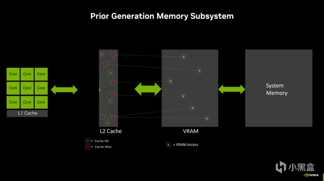 内核在计算的过程中会不断的调用存储子系统的数据,顺序是L1缓存、L2缓存、显存、内存,越往后响应速度越慢。为了赶上快速刷新的游戏画面,GPU所有的数据会经过预加载放置在缓存中,因此缓存容量越大,下一帧所需要素材的命中率就越高,GPU跑腿寻找数据所需要的时间就更短,效率就更高。同样,GPC都需要通过L2缓存完成所有访存操作,即Ada Lovelace架构中的第四代Tensor Core和第三代RT Core性能提升也会通过L2缓存实现。