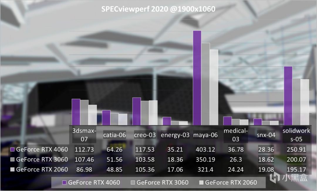 除此之外,COLORFIRE GeForce RTX 4060暗影紫8GB在常规的创意测试中表现同样强劲。比如工程类的SPECviewperf 2020包含了包含能源勘探、医学、建筑设计、机械设计、汽车设计、飞机设计领域的专业软件图形测试,涵盖3dsmax、Catia、Creo、Energy、Maya、Medical、SNX、Solidworks。这里GeForce RTX 4060相对GeForce RTX 3060 12GB平均提升33%,相对GeForce RTX 2060平均提升41%。