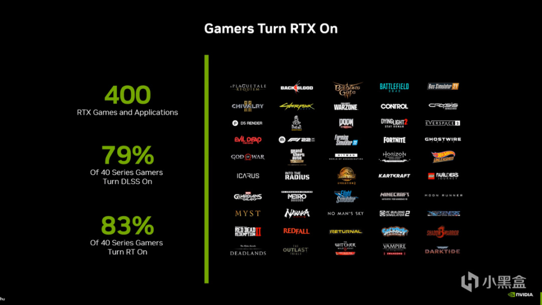 接下来开启光线追踪最高画质加DLSS 3才是重头戏,RTX生态发展的5年中,已经获得了超过400款游戏的支持,其中会有79%的RTX 40系列用户开启DLSS,83%的RTX 40系列用户开启光线追踪。