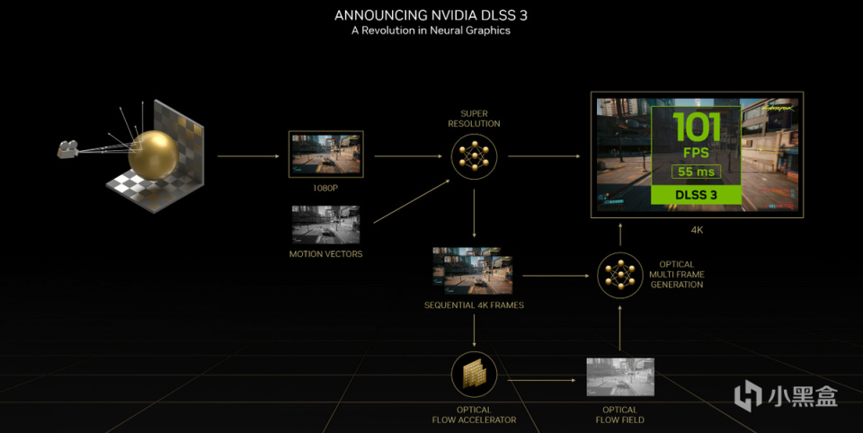 第四代Tensor Core则配合新光流加速器、NVIDIA Reflex等技术组成了DLSS 3。更确切的说,DLSS 3是一套包含了提升游戏帧率、降低系统延迟的完整解决方案。它通过引入光流加速器(Optical Flow Acceleration,OFA)与DLSS相结合的办法,构建出了一个更为立体的分析方式,将卷积自编码器的输入源扩展到几个部分,分别是:之前帧与当下帧,由光流加速器生成的光流场、游戏运动矢量和深度等数据。这时候DLSS 3甚至承担起渲染过程中7/8的工作,让CPU和GPU进完成其中1/8的渲染即可,从而节省出大量的计算资源专注到更有用的地方。