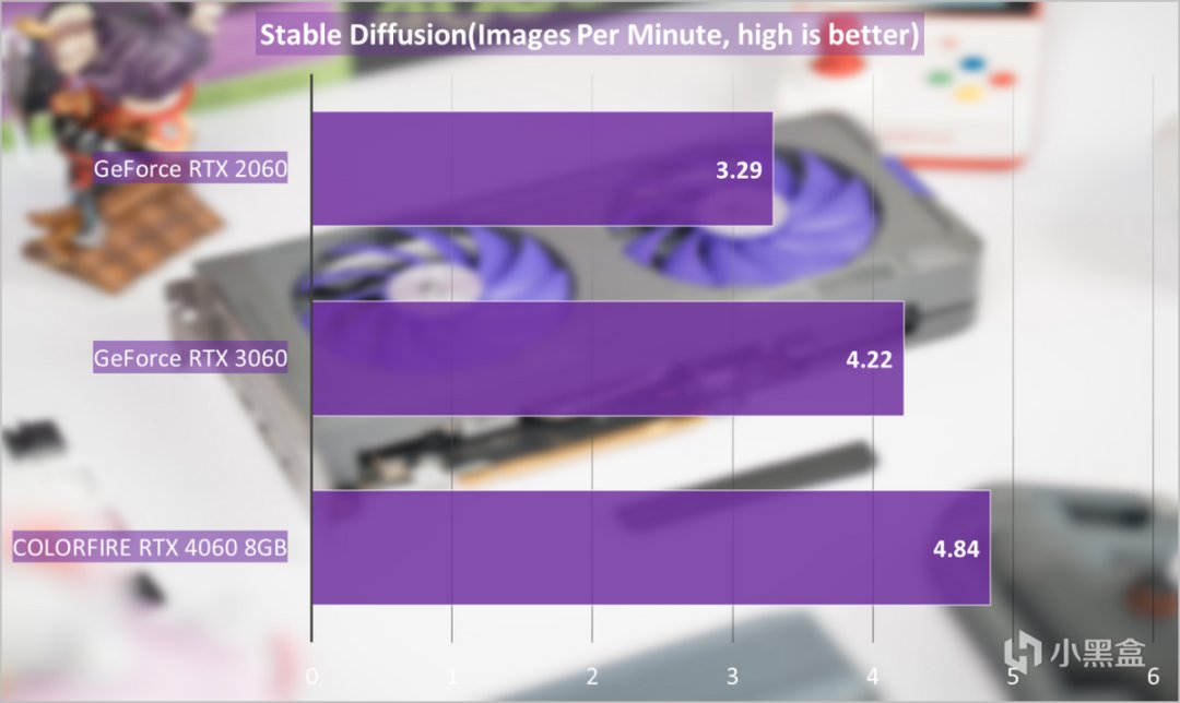 最后是AI性能表现。这里先引用喜闻乐见的Stable Diffusion 2.1,依然是,让GPU同时运算2张图片,总共运行10次,即20张。每张图片分辨率为768x768分辨率,采样步数设置为50。通过记录每个GPU花费的时间,并进一步推算出每分钟生成的图像效率(Images Per Minute)。可以看到,COLORFIRE GeForce RTX 4060暗影紫8GB的AI性能相对GeForce RTX 3060 12GB提升14%,相对GeForce RTX 2060提升47%。