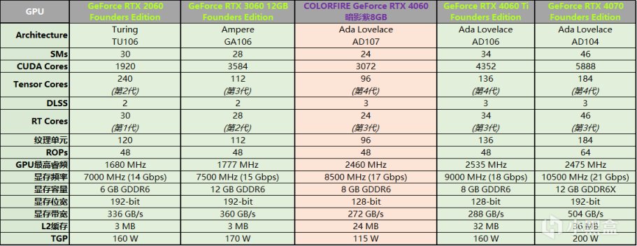 因此COLORFIRE GeForce RTX 4060暗影紫8GB哟好难过又3072个CUDA Core,96个第四代Tensor Core,24个第三代RT Core,以及前面提到的最高2460 MHz频率,8GB 128-bit GDDR6显存和TGP 115W。对比如下。