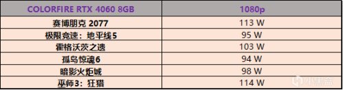 而GeForce RTX 4060本质上就是一款低功耗的GPU,待机功耗控制在了7W之内,TGP 115W,并且COLORFIRE GeForce RTX 4060暗影紫8GB的最高频率与公版持平,为2460MHz。从实测的游戏来看,显卡功耗基本在110W上下,只有《赛博朋克2077》、《巫师3:狂猎》光追特效全开,对RTX 4060造成运算压力的有场景才有机会把GPU功耗全部吃满。