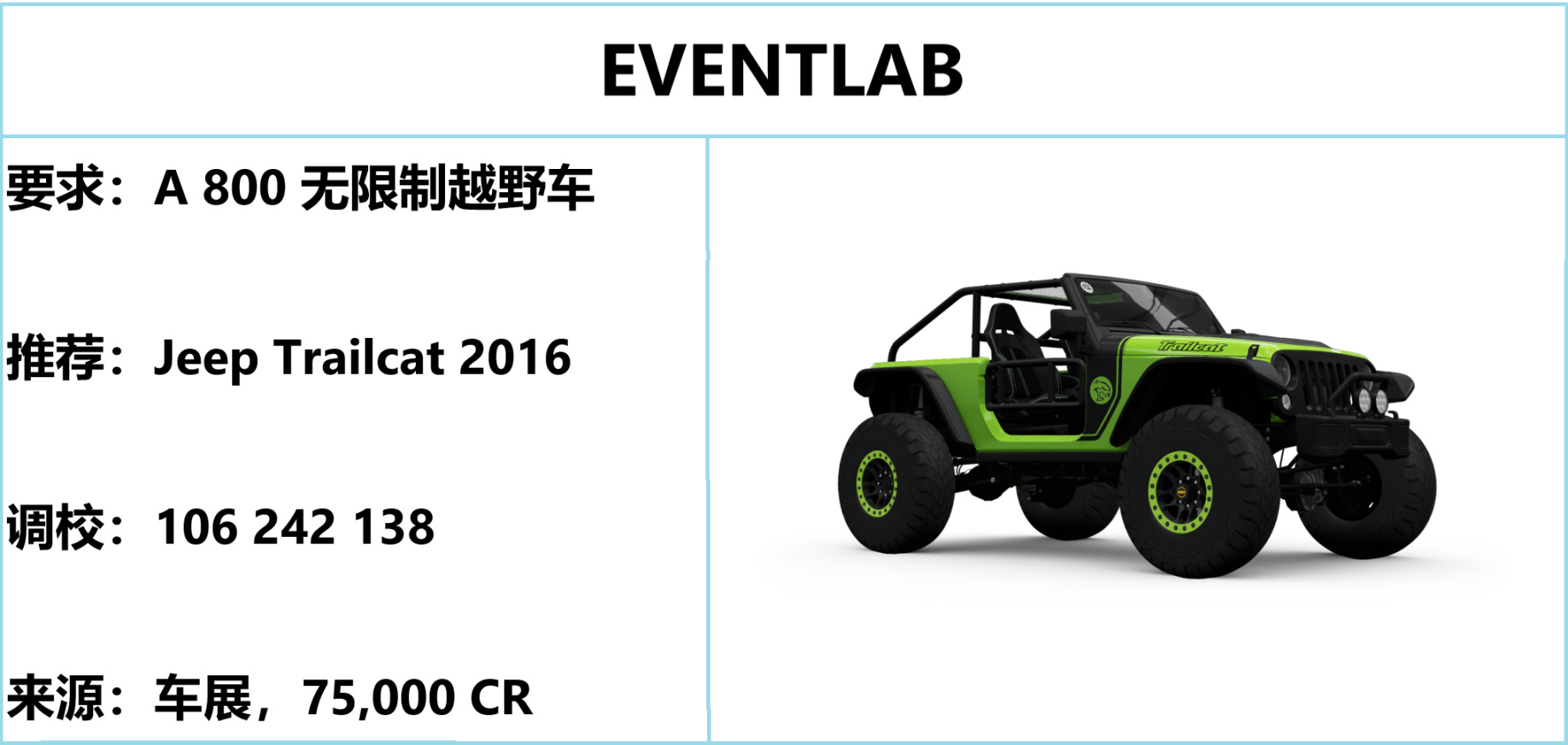 该车属于无限制越野车分类,可用于两个 EVENTLAB 赛事。