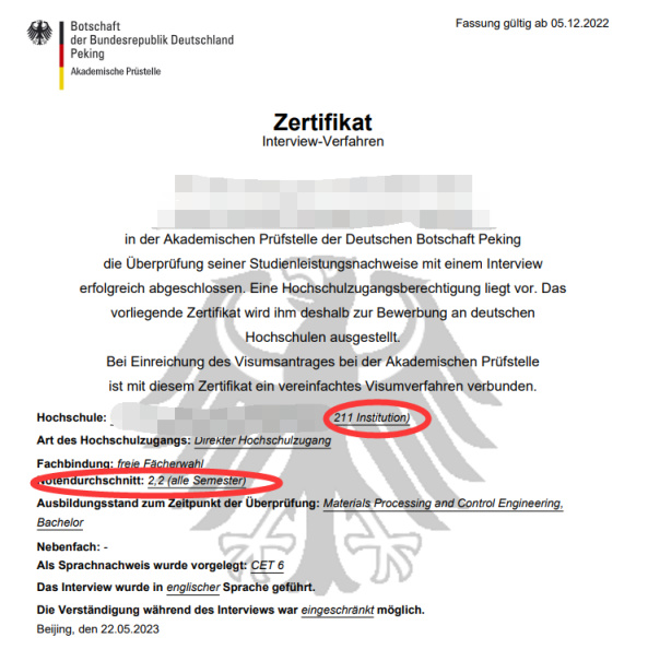 2、個人審覈,適用於你已經在國內讀了,但是你想要去德國讀本科或研究生。如果學校和專業你不喜歡,準備去德國重讀本科,那麼需要211學歷讀一個學期提交成績單,或者本科學歷提供3個學期的成績單(應該是),但是存在掛科的學期是不算的,比如說你高數掛了,那麼相當於你沒有學完這個學期,是不允許的。想要去德國讀研究生,那麼需要你最少6學期的成績,如果不夠後期需要多交1000塊錢補審。個人審覈需要進行面談,也就是拿着成績單和外國考官面談,他指着成績單問你課,你用德語和英語講一下你在課上學到了什麼之類的。(部分人感覺很難,我個人感覺挺簡單的,只要用心複習)一共三次機會,都不通過就基本上告別德國留學了,所以要重視。