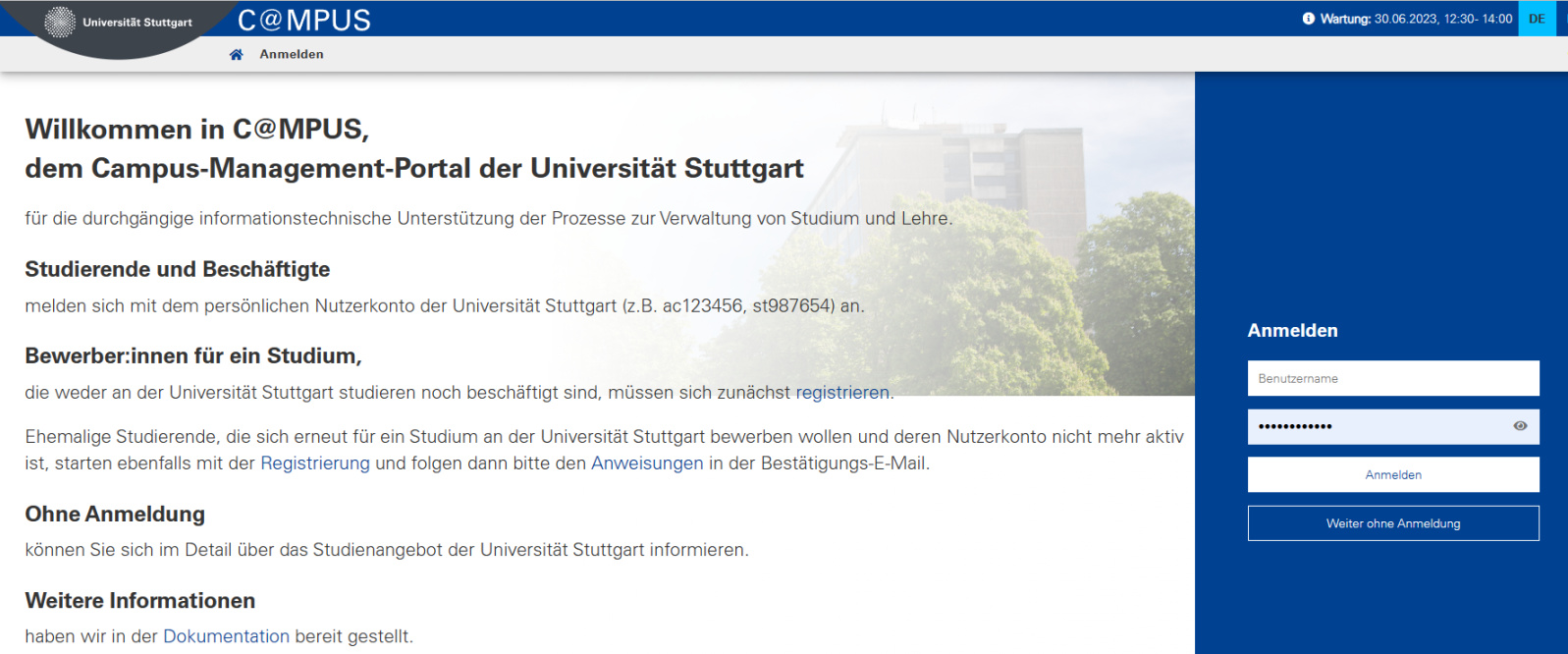 另一種就是去大學的官網進行申請,大部分學校都有申請用的信息門戶,在主頁可以找到,以斯圖加特大學的門戶爲例,註冊以後就可以開始申請了。