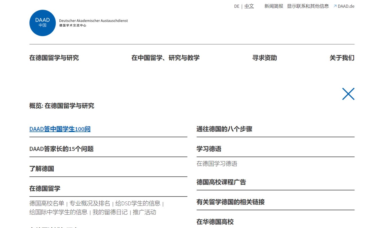 當你通過了APS審覈,就該瞭解德國的學校了,所以留德華必須知道的網站就是DAAD。全稱Deutscher Akademischer Austauschdienst。在這裏你能看到德國留學的大部分問題,也能看到德國大學的排名,專業排名,申請條件等。推薦大家在瞭解學校時使用英文版網站,因爲中文版網站有很多刪減部分。