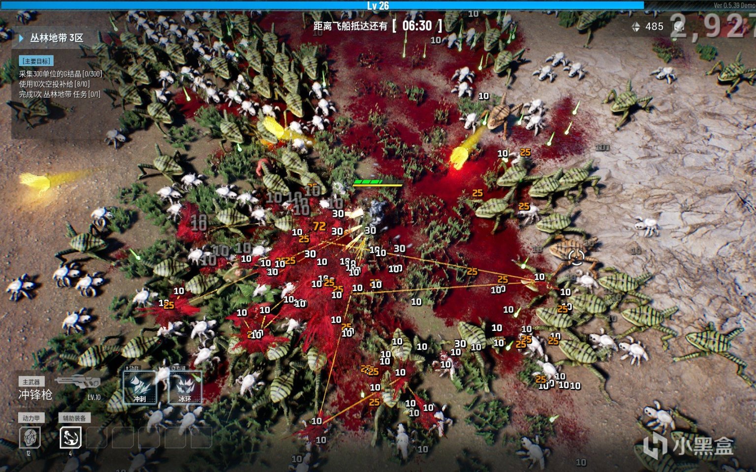 從目前展露的demo來看,遊戲的build深度以及平衡性都還有待提高。遊戲中玩家需要扮演一個去陌生星球擊殺怪獸收集資源的傭兵,而遊戲的升級設定和同類型的遊戲並沒有什麼差別,擊殺敵人,然後收集其經驗球,通過其獲得的經驗球來升級,每次升級會有四個選項供玩家選擇,其中大致有主武器、威力、護甲、修復、輔助武器、技能幾大類,而在着幾大類下還有着細分的諸多小類讓玩家選擇,雖然聽上去數量繁多,但是遺憾的是製作者並沒有將其兩兩之間做出聯動的效果,更多的是每個輔助武器和主武器的升級之間毫無關聯,這也就導致了遊戲中的另一個小問題:武器的平衡性問題。