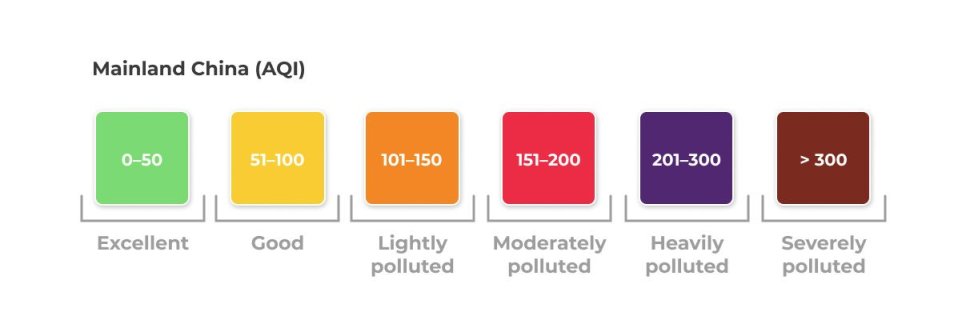 中国的空气质量指数(AQI)范围从 0 到 500,与美国的 AQI 类似。不过,它们的标准和等级有所不同。中国 AQI 分为六个等级: