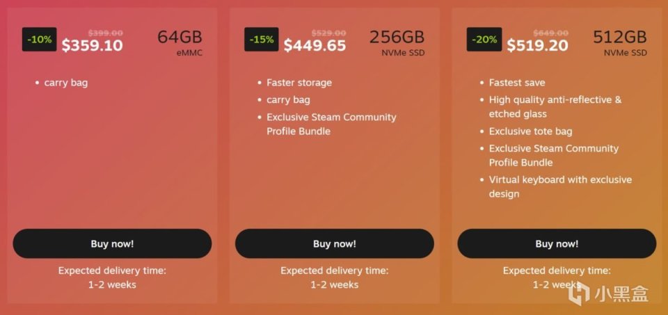64GB版本目前零售价为≈2399元(建议零售价399美元,≈2999元),有10%的折扣,Steam还把256GB和512GB型号的售价降低了15%和20%,目前的售价或为3699元,比3月份的售价(584美元或者近4300元)便宜很多,因此现在可以把钱花在刀刃上