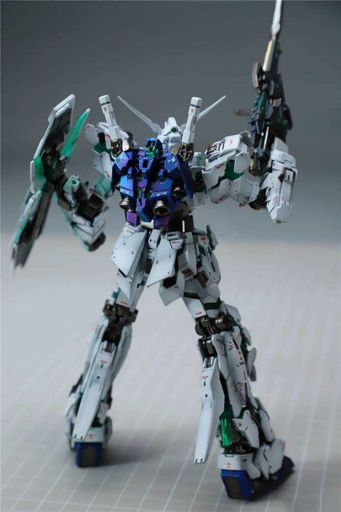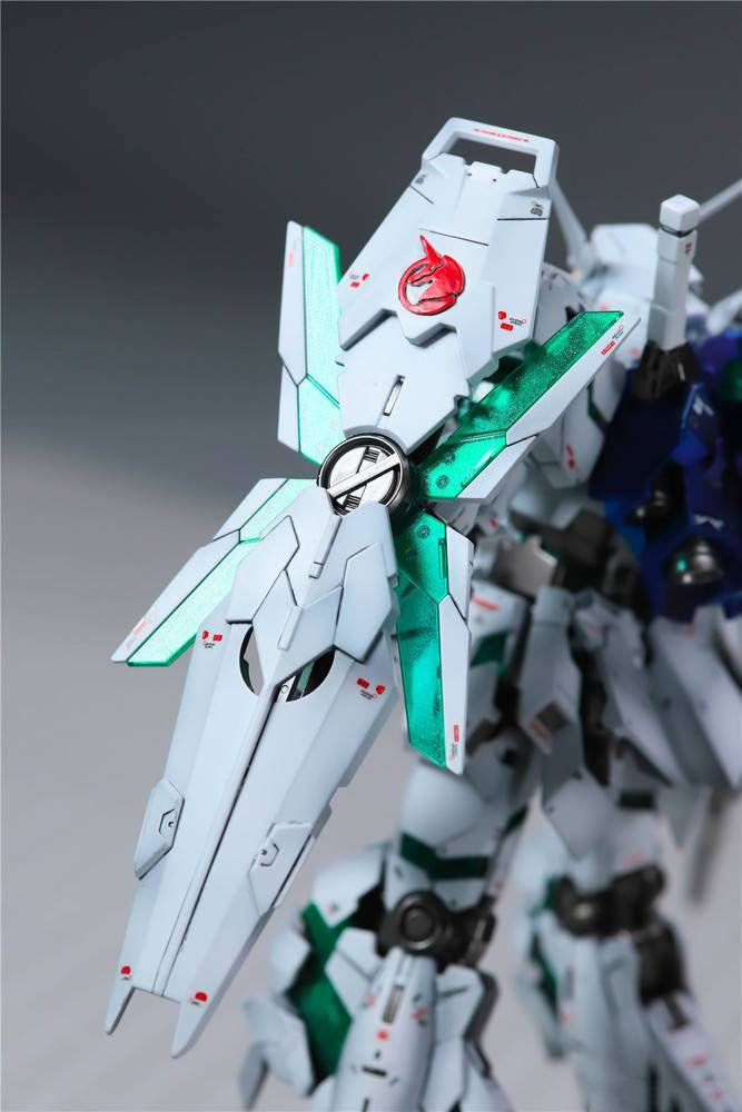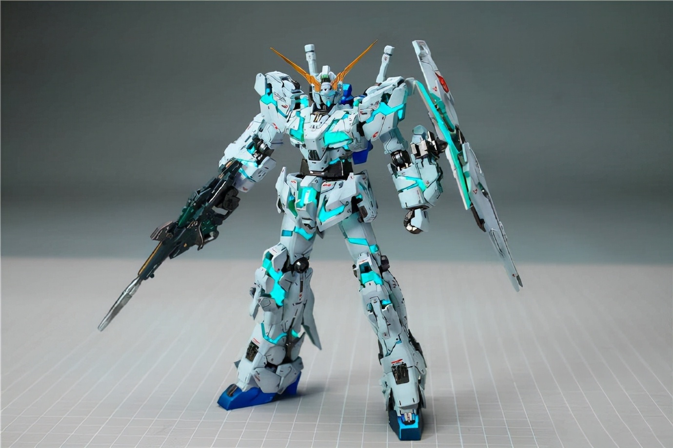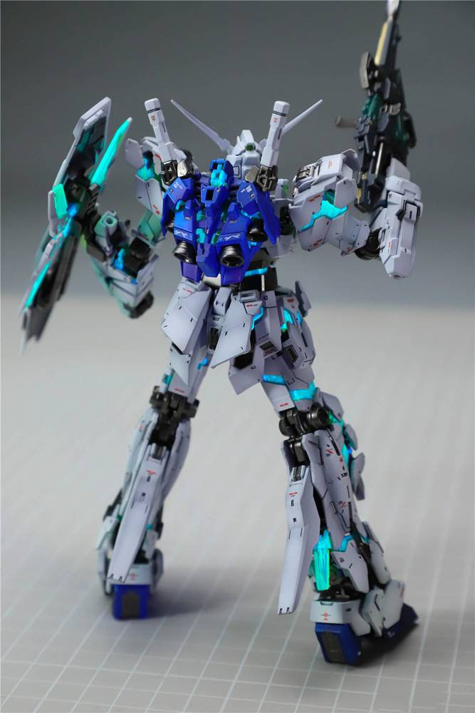 爲了豐富玩法,模友還爲RG獨角獸高達模型的精神力骨架上增加了熒光漆,在燈光的照射下散發着比較“耀眼”的光效。