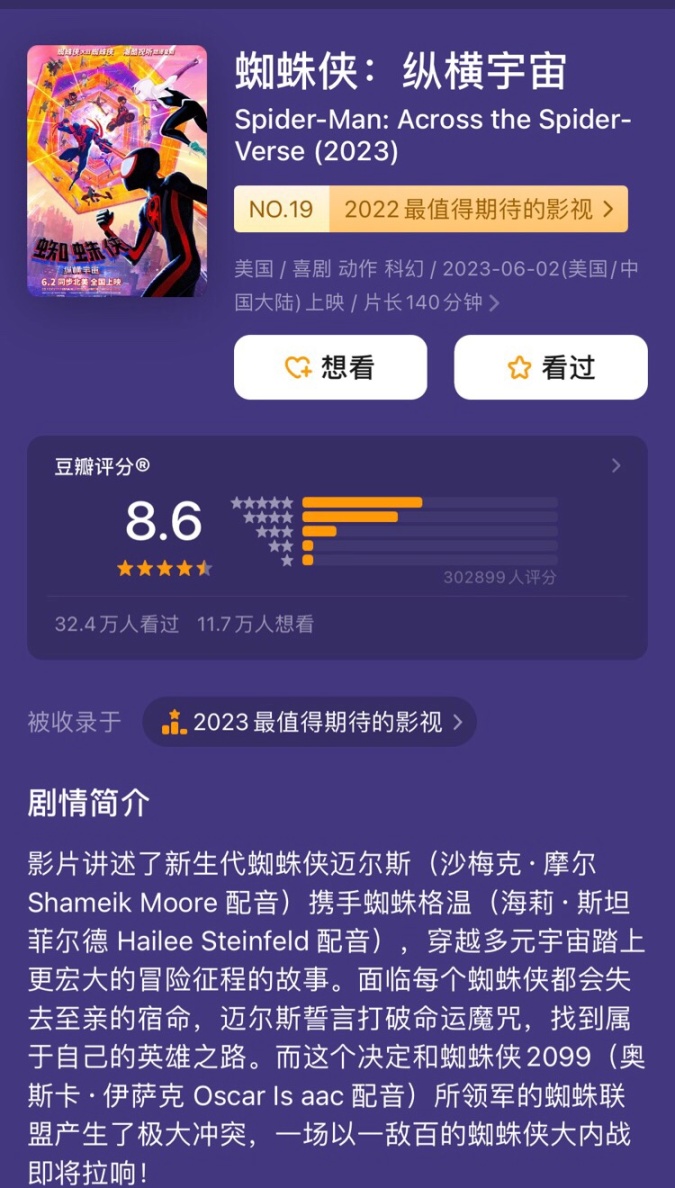 (1)《纵横宇宙》媒体观众口碑评分都非常高,该电影于2023.6.2上映,与第一部《平行宇宙》(平行宇宙拿了奥斯卡最佳长片动画奖)隔了5年,本片有不少惊喜也有小小的遗憾吧,大型预告片警告⚠️有各种蜘蛛侠、超英的彩蛋和梗,140分钟的时长是我看过最长的动画