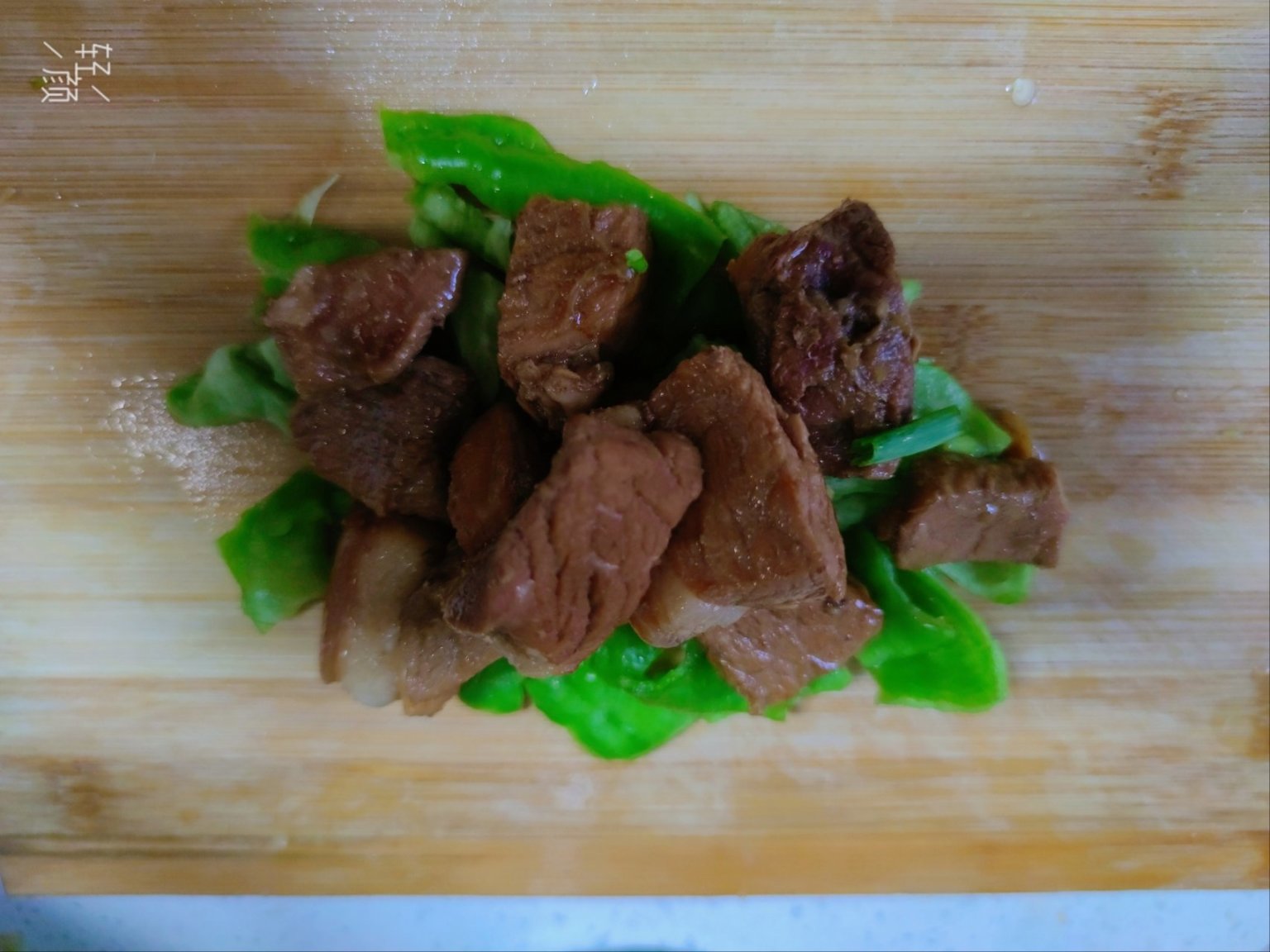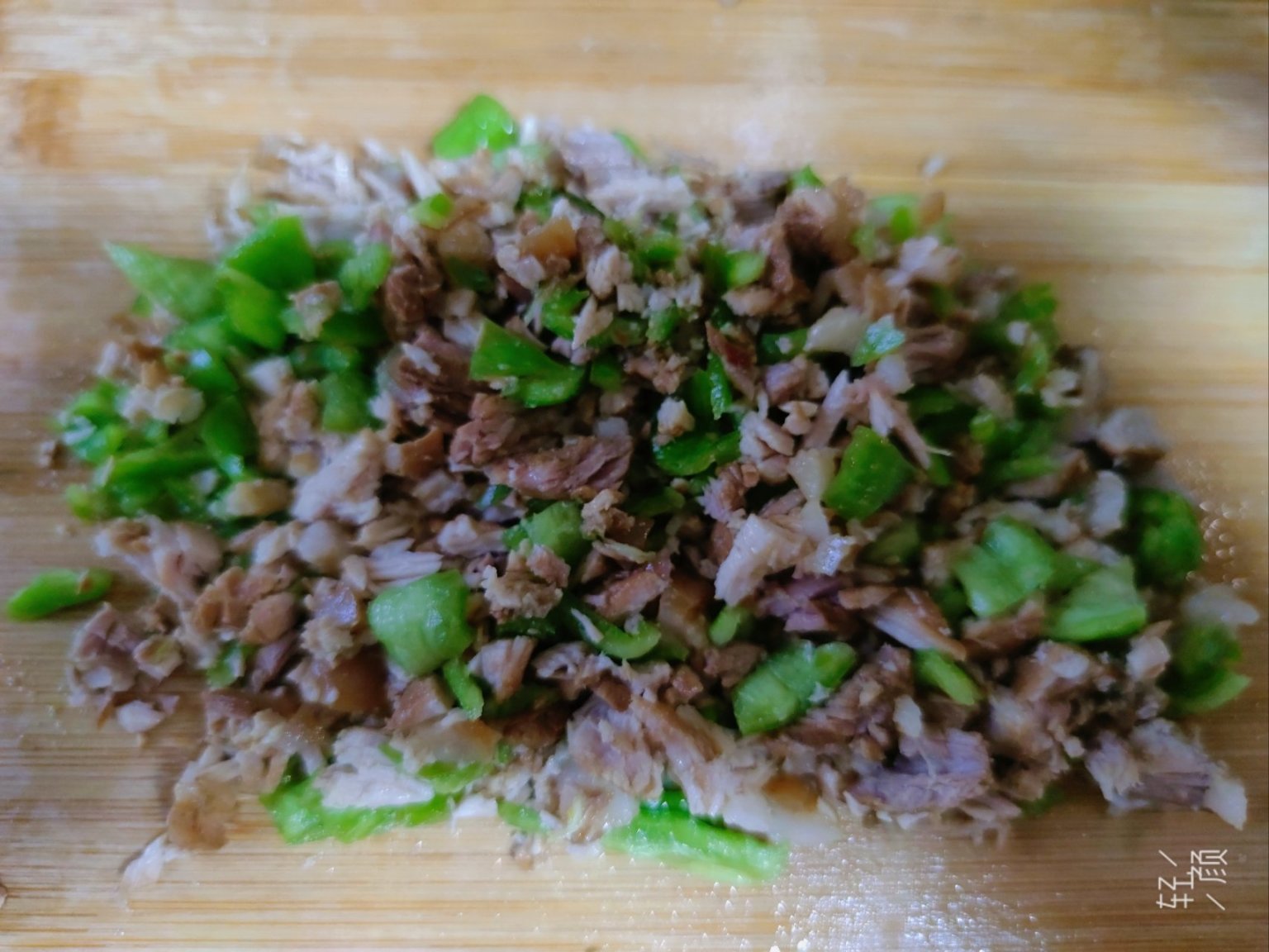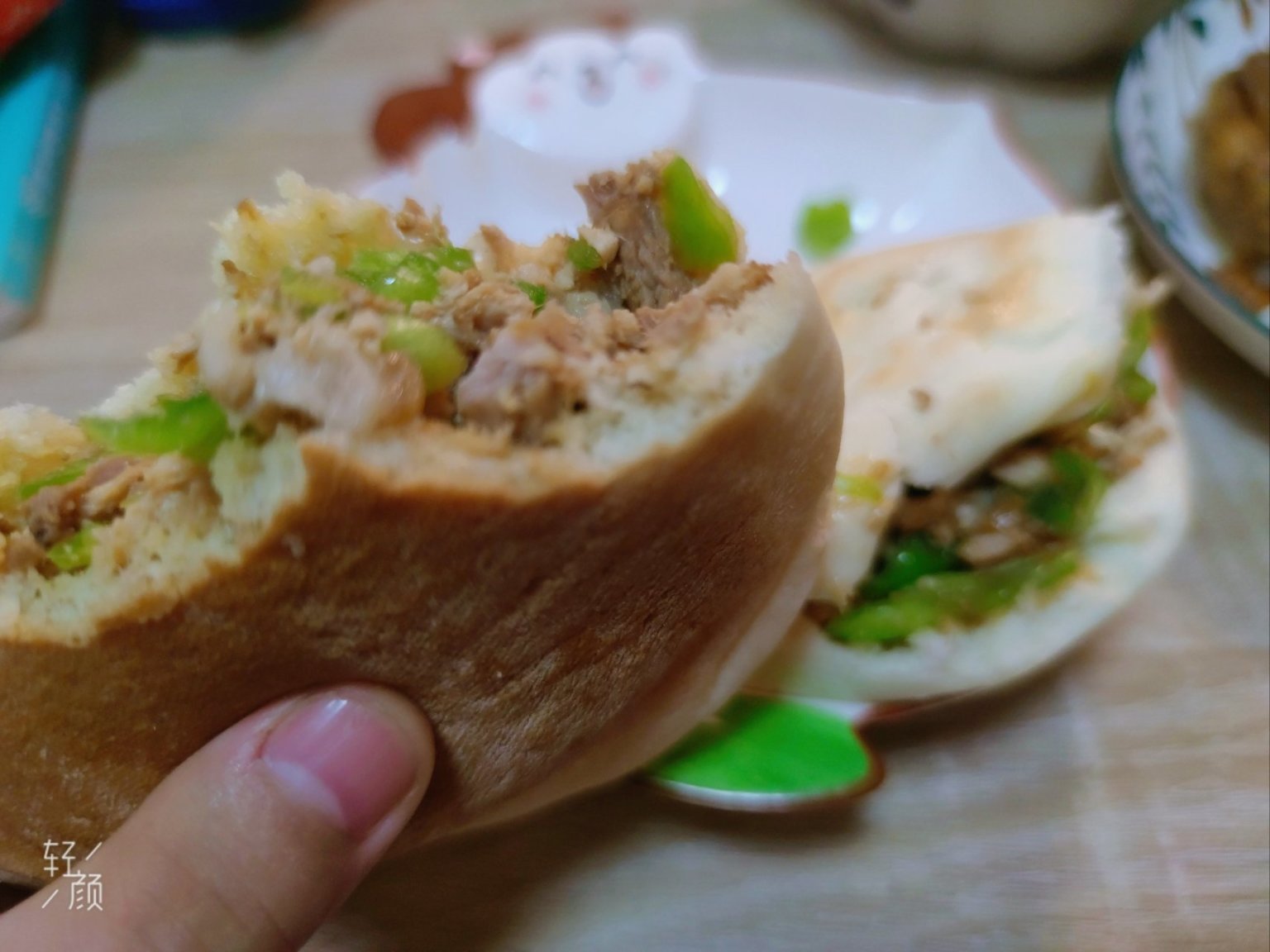 将炖烂的肉捞出,就这青辣椒一起切碎,拿出白面饼开出一道口,将碎肉放进去,然后淋上汤汁,就可以开造