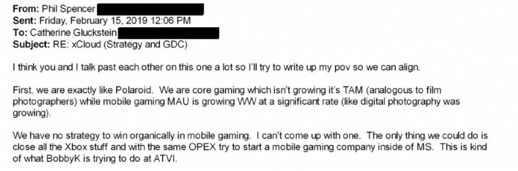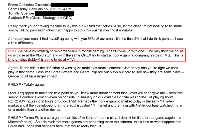 在一封写于2019年的邮件中,斯宾塞写道:“我们没有一个能够让我们在移动游戏领域取得胜利的战略,我无法想象。唯一的选择是关闭与Xbox相关的一切,并以相同的运营成本在微软内部尝试创建一家移动游戏公司。这正是Bobby Kotick正试图在动视暴雪实施的策略。”他把这封邮件发给了Xbox总裁Catherine Gluckstein。