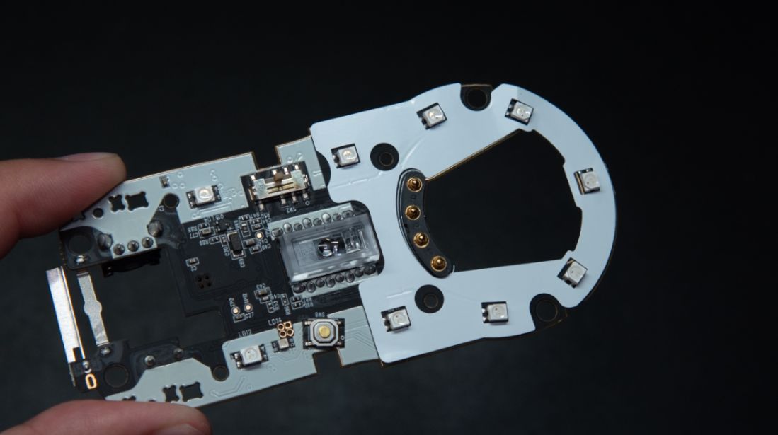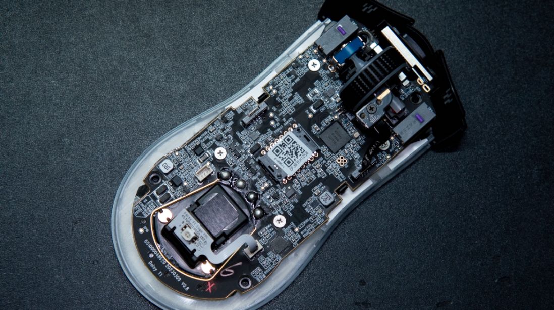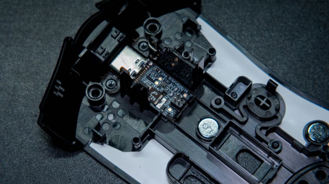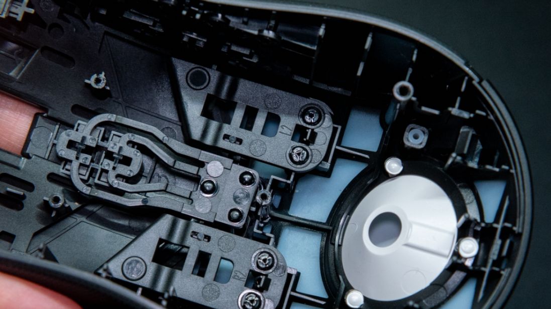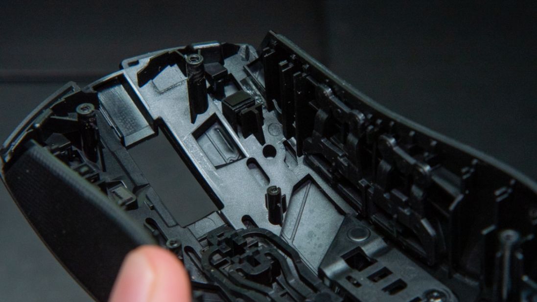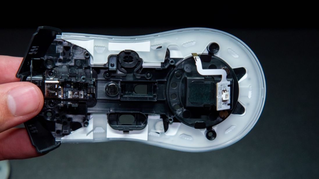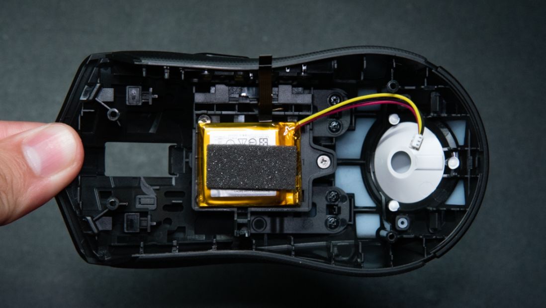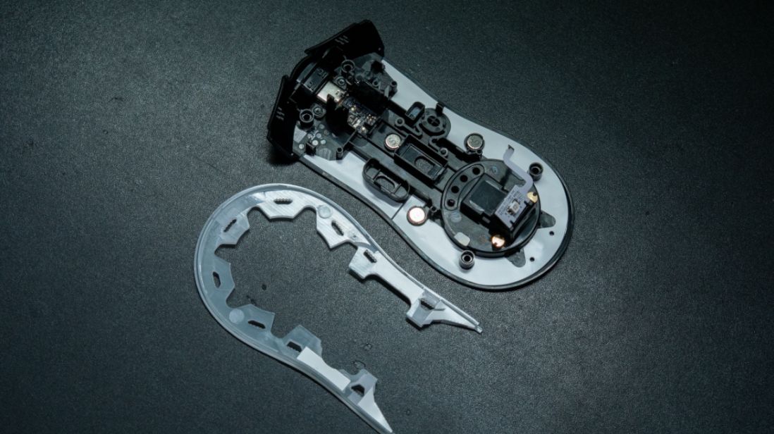 鼠标的电池和侧键都被一块中框固定在上半部分,下半部分为主板和底部发光条。