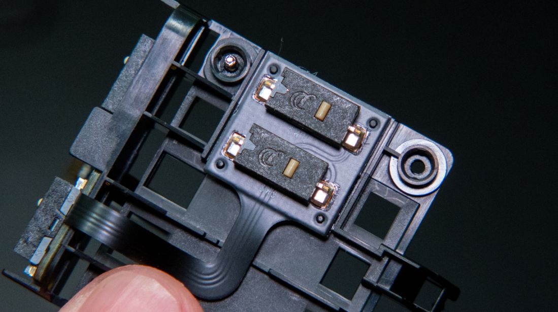 来看上盖,电池和侧键小板以及DPI切换键都被固定在同一个中框内。