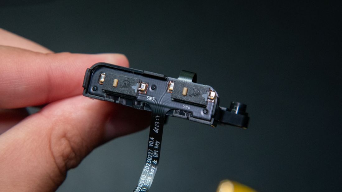 主键和侧键均采用热熔固定,同时能看到一些减重设计。