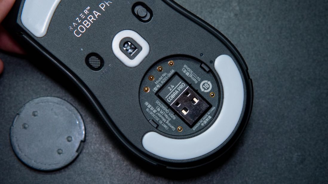 鼠标底部则是接收器收纳仓和无线充电触点,额外购买一个无线充电线圈就能实现给鼠标的随放随充。