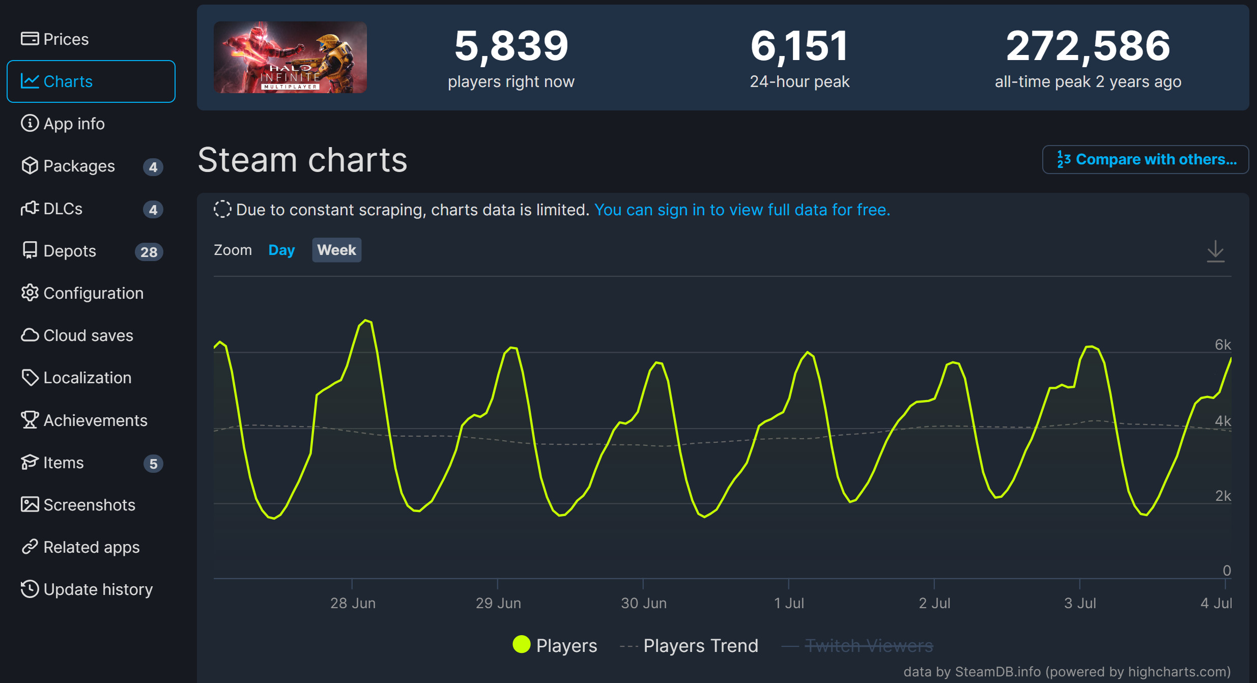 根據SteamDB統計,雖然《光環:無限》在Steam上的最高同時在線人數達到了27萬2586人,當前在線5839人,24小時峯值6151人。