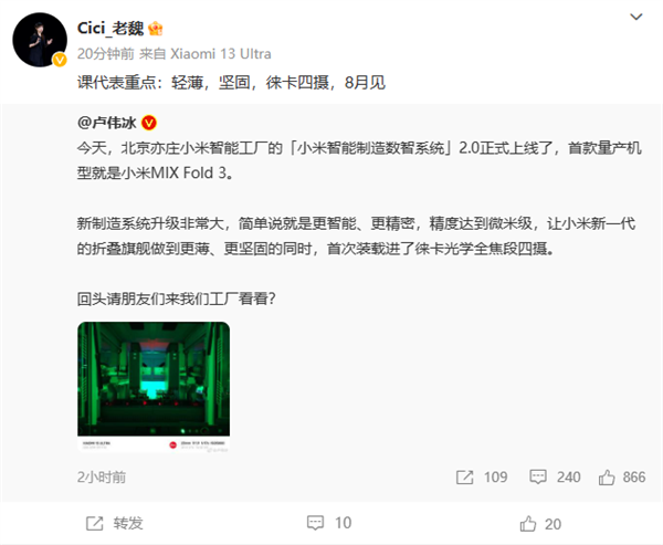 快科技7月4日消息,今天下午卢伟冰在微博晒出了北京亦庄小米智能工厂的“小米智能制造数智系统”2.0,并透露其生产的首款量产机型就是小米MIX Fold 3。