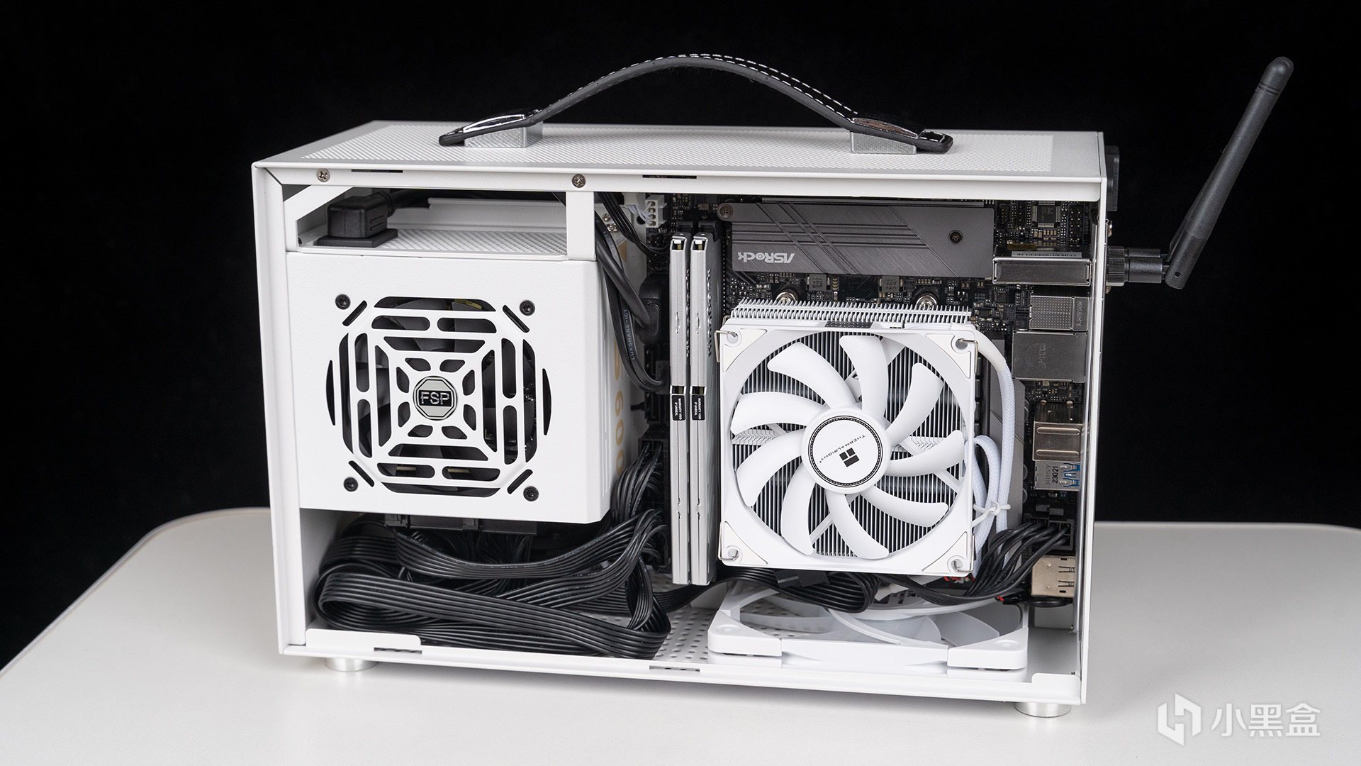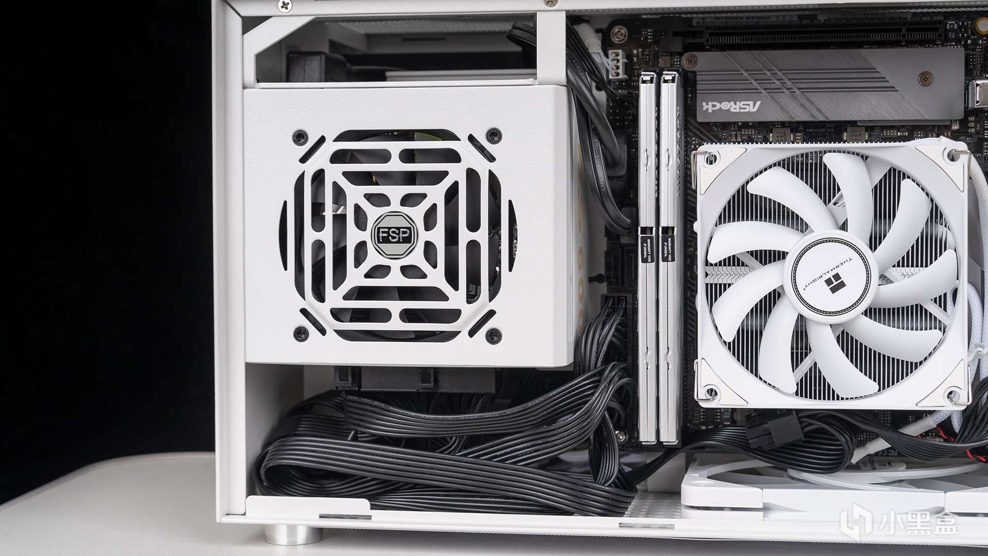 主板和电源仓就很饱满,本来担心12015风扇会和CPU供电线材冲突,结果发现它俩之间的空隙还挺大,并不会过于拥挤打到扇叶。