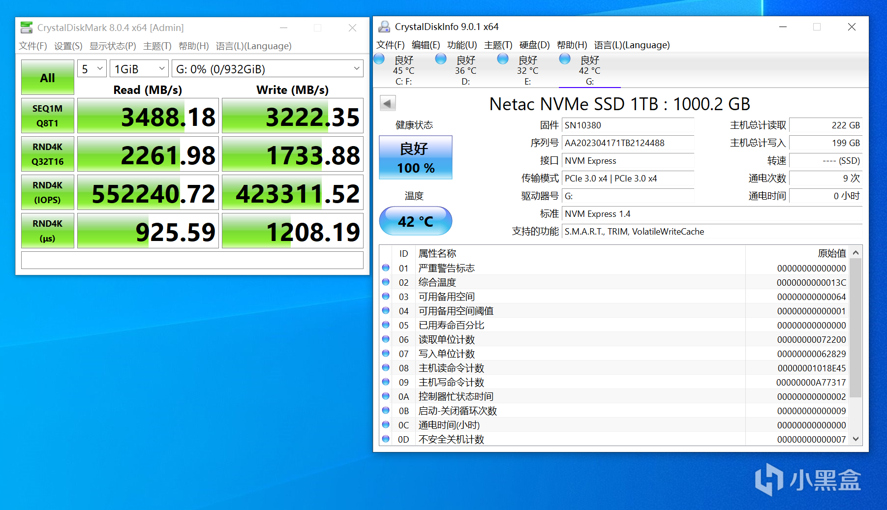 CrystalDiskMark峰值性能测试,朗科NV3000 1TB顺序读取速度为3488.18 MB/s,顺序写入速度为3222.35 MB/s,4K随机读写IOPS读写速度分别达到552K IOPS和423K IOPS,和PCIe 4.0固态理论速度自然比不了,但在大部分日常使用环境中,就是不会感到差距的,跑分时搭载主板散热片,最高温度只有42℃,比SATA3.0固态还低。