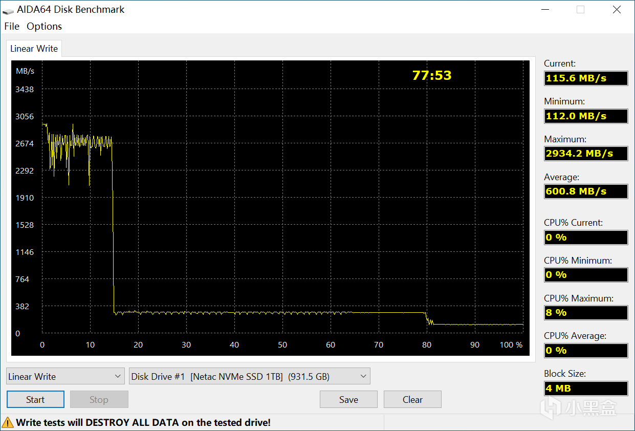 N550S 1TB已经作为系统盘就不测全盘写入了,这里就测下NV3000 1TB,空盘状态下,NV3000 1TB在模拟SLC缓存阶段中,写入速度可维持2300 MB/s-2800 MB/s之间,TLC原始阶段为360 MB/s左右,最后在擦除回收同时写入时,速度为127 MB/s,这个盘现阶段只是用来存储照片和视频,足以满足需求。