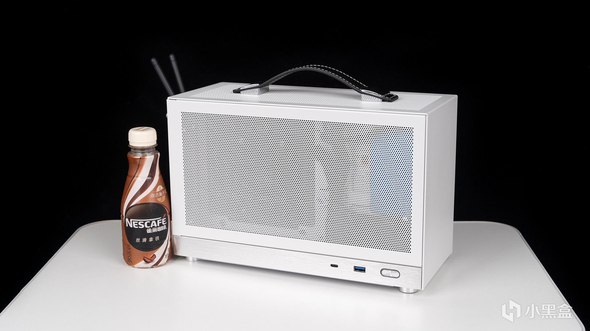整机和268ml雀巢咖啡放在一起,可以感受一下它的实际体积大小,不过闪鳞S300对应有I/O那一面是显卡仓,没有独显情况下还是能透过网孔看到里面的线材,可能会显得比较空荡。